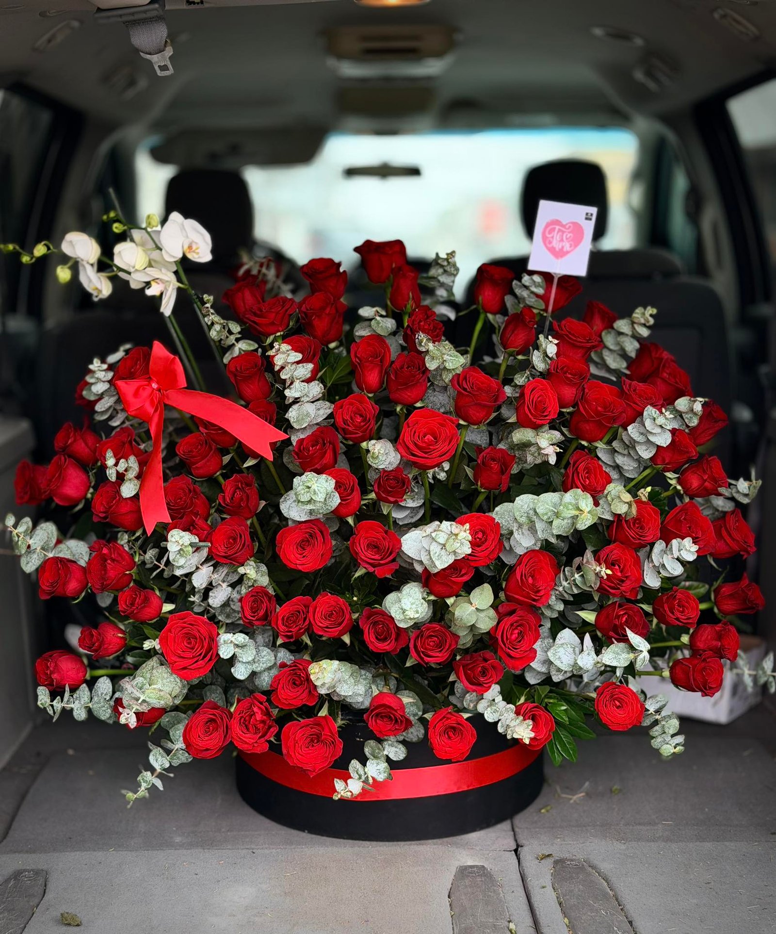 El arreglo que te deben regalar por lo menos una vez en tu vida. Caja grande con 80 rosas y eucalipto. Puedes agregar lirios u orquidea, solcita cotización especial por whatsapp.