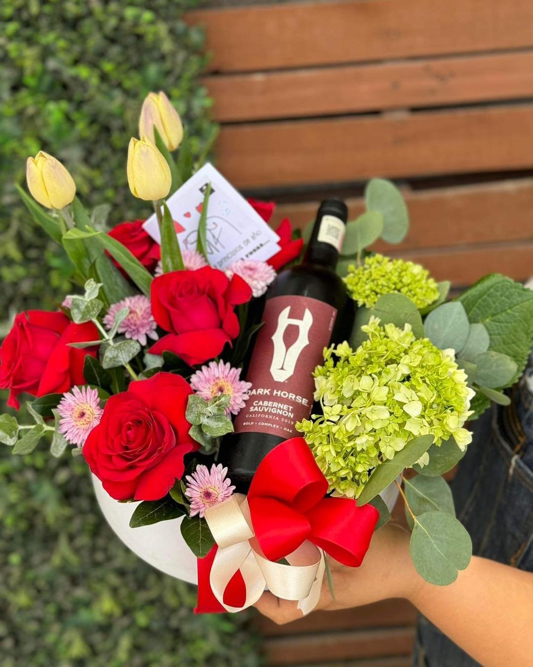 Base de ceramica esmaltada, con fores frescas como rosas rojas, hortensias verdes, dándole elegancia con tulipanes y coronando con una deliciosa botella de vino. Apto para cruzar a Laredo, solo solicita las modificaniones.