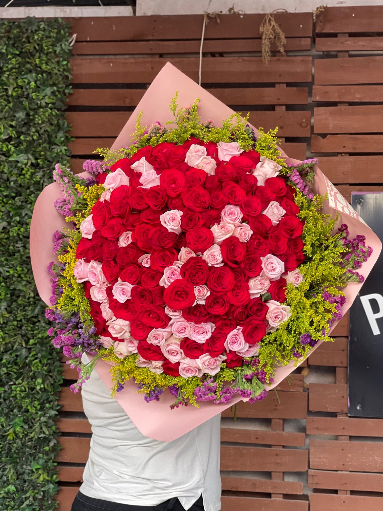 Atado de 40 rosas rosa combinadas con 60 rosas rojas con solidago y statice alrededor.